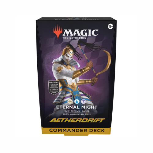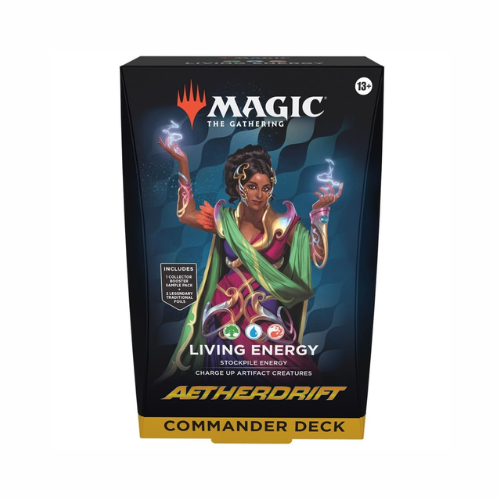 En Commander, cuatro jugadores se unen para mostrar su fuerza y estrategia, y un jugador sale victorioso. Cada mazo de Commander de Deriva Etérea de 100 cartas listo para jugar hace que sea fácil para los fans de Commander en tu tienda hacerse con un mazo y jugar de inmediato.
